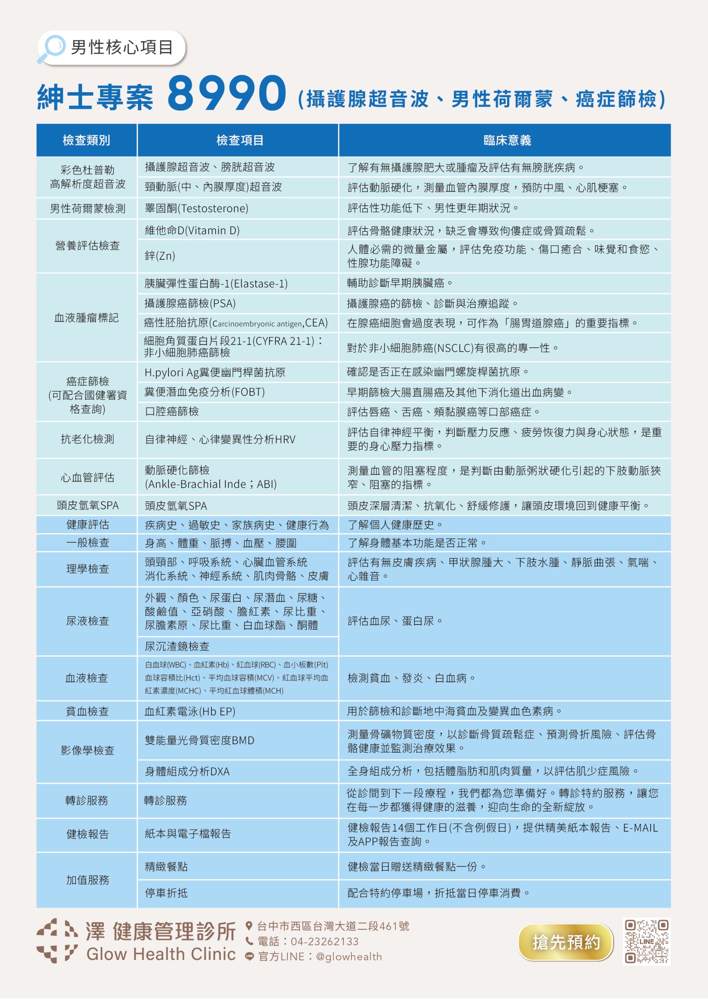 如 攝護腺、癌症篩檢、心血管與男性荷爾蒙 等指標整合安排, 在同一天完成檢查流程, 讓您一次掌握與男性健康相關的重要數據,而不是分批檢查。